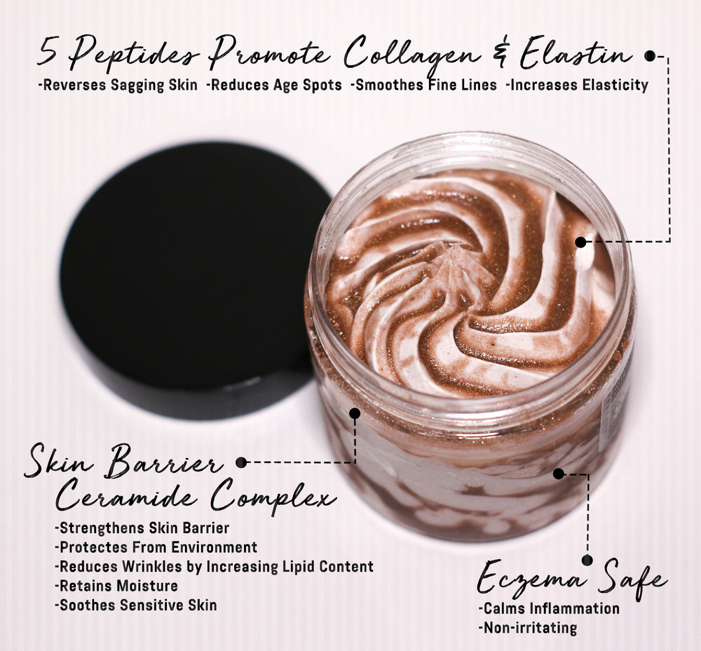 Mango Butter, Shea Butter, Glycerin, Tamanu Oil, Safflower Oil, Raspeberry Seed Oil, Lauryl Laurate, Vitamin E, Gota Kola, Arnica, Cacay Oil, Sodium Acetylated Hyaluronate, Hydrolyzed Sodium Hyaluronate, Cetearyl Alcohol, Sunflower Wax, Ginko Extract, Hydrolyzed Plukenetia Volubilis Seed Extract, Bakuchi Fruit Extract, Hibiscus Extract, Water, Palmitoyl Tripeptide-38, Apple Stem Cell Extract, Ceramide NP, Ceramide AP, Ceramide EOP, Hibiscus Extract, Tripeptide-1, Tetrapeptide-3, OligopeptidE-1 Hexapeptide 11, Stearic Acid, Fragrance, Preservative